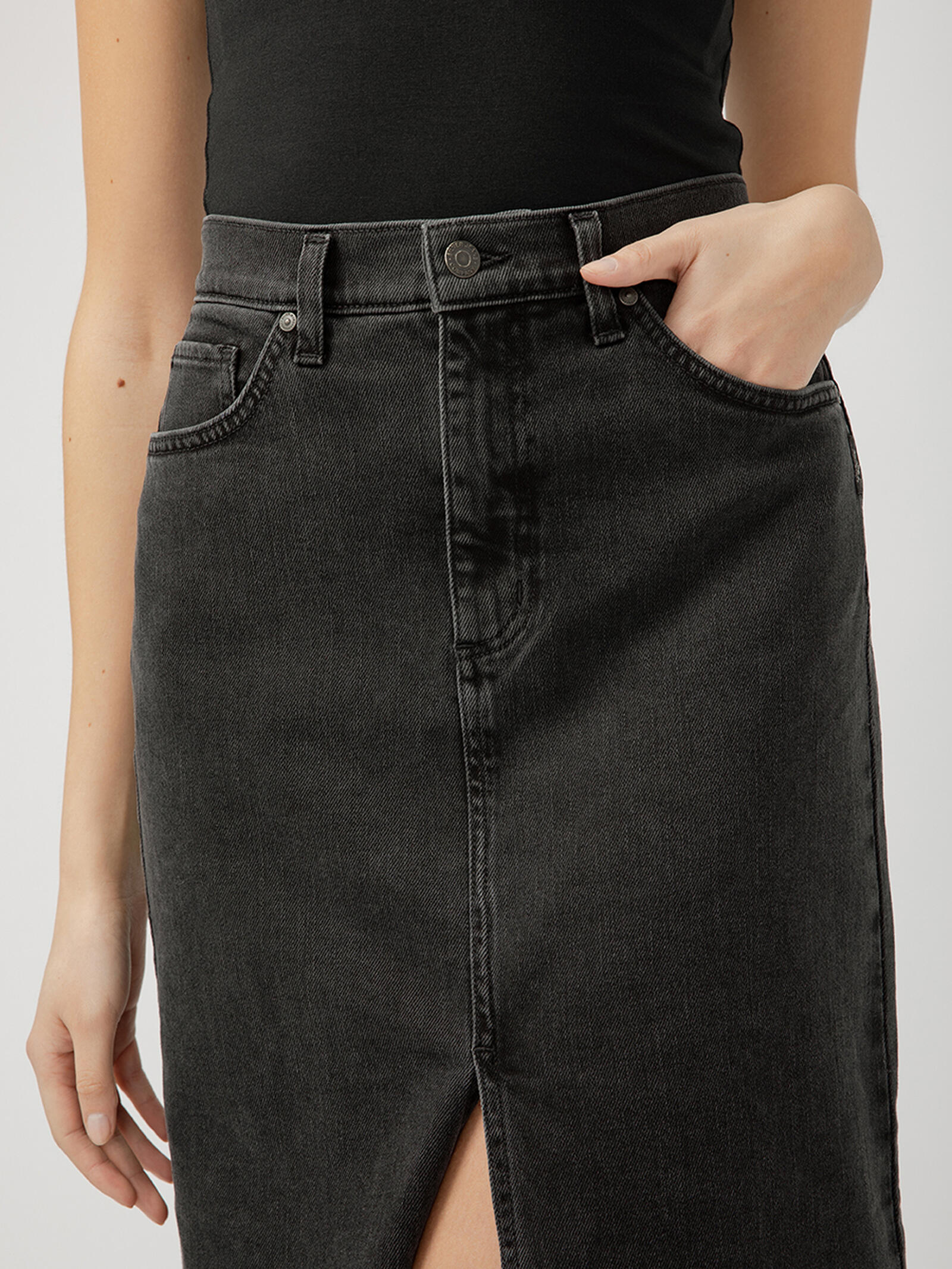 • Black denim maxi skirt with a front slit