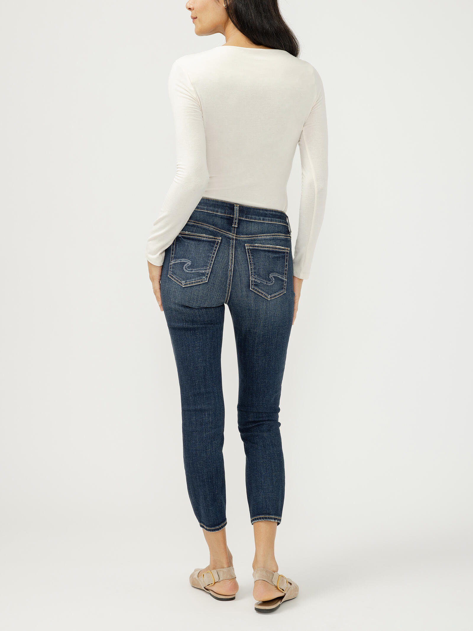 - Cropped skinny leg jeans in a dark indigo wash