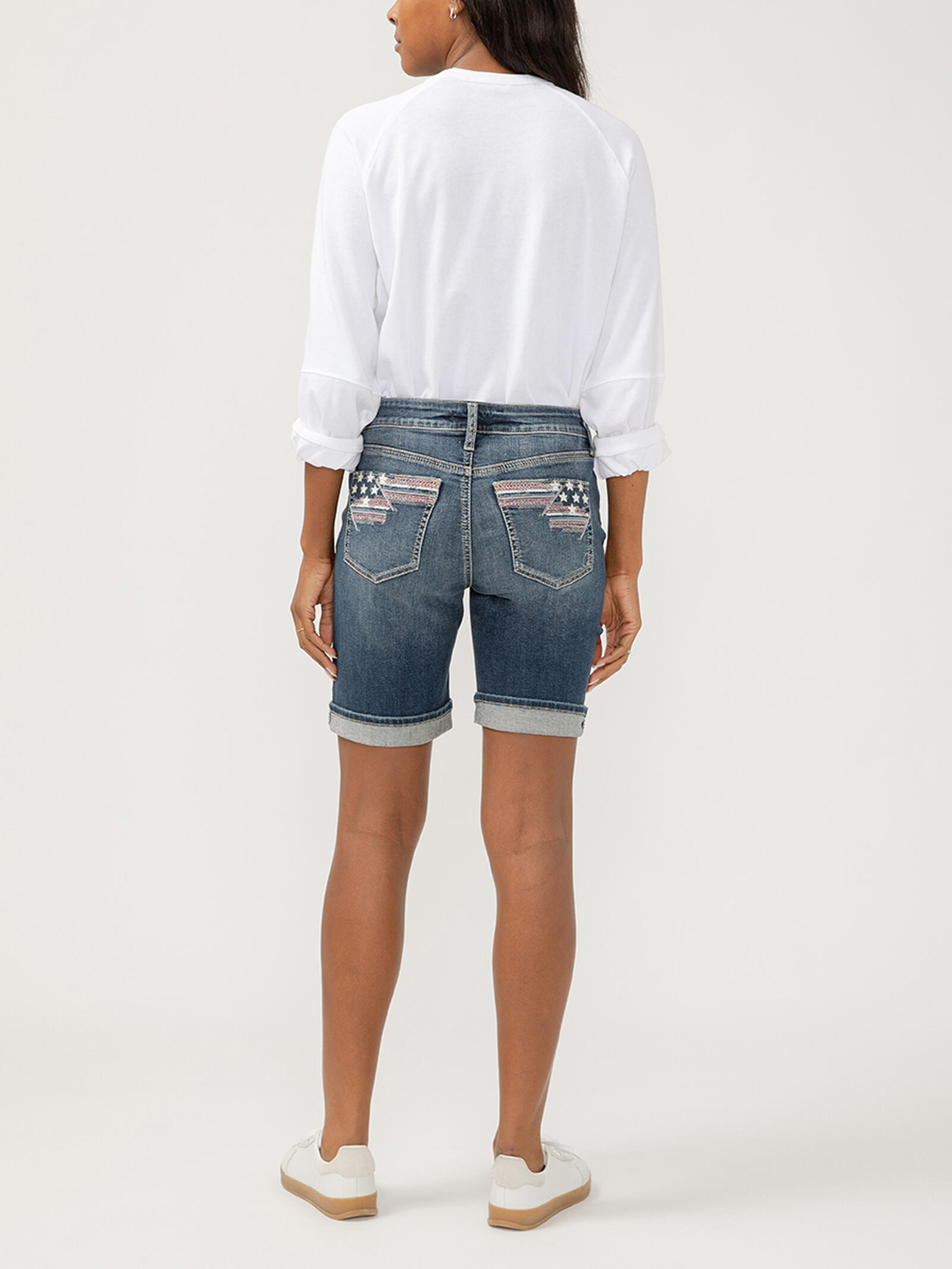 • Mid rise Bermuda shorts in a medium-dark indigo wash and American flag details