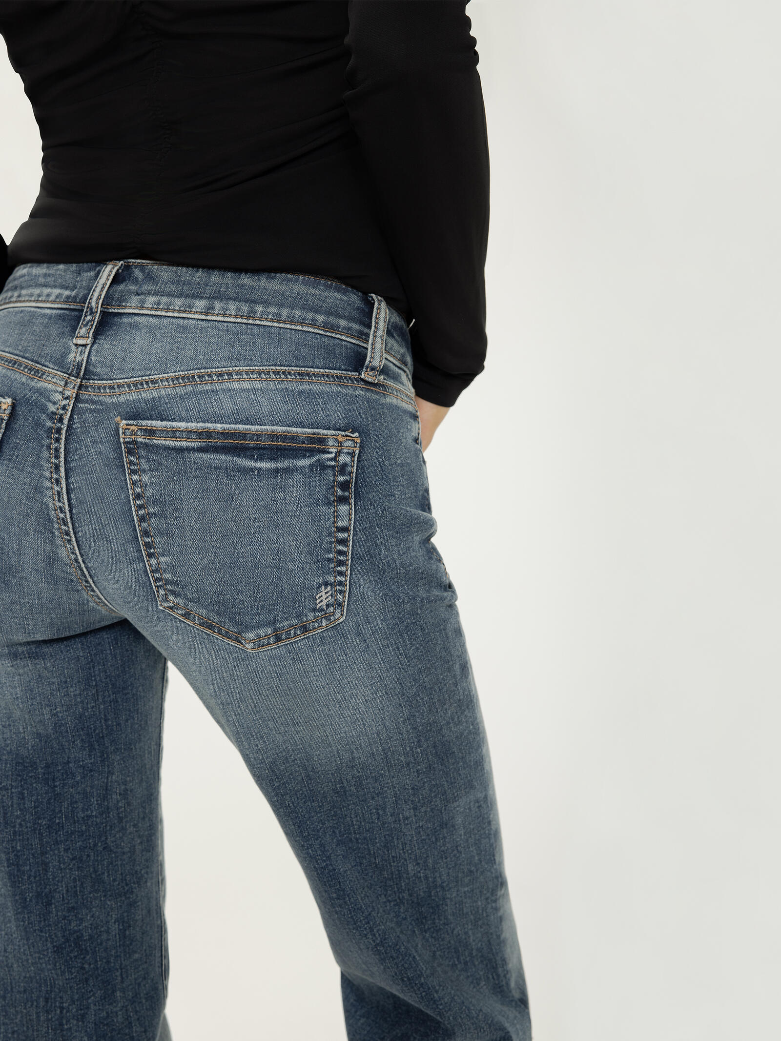 - Trouser leg jeans with a medium indigo wash