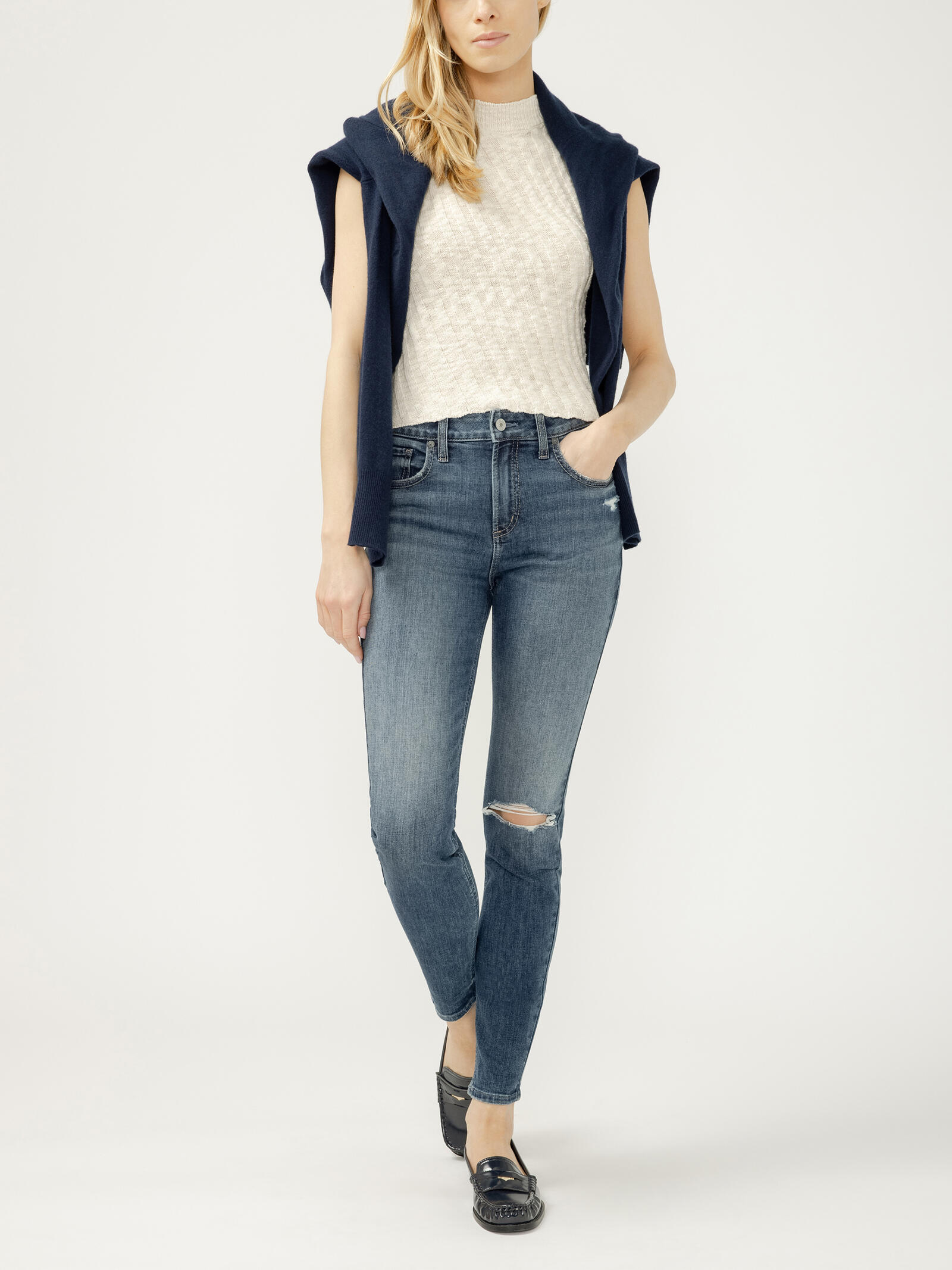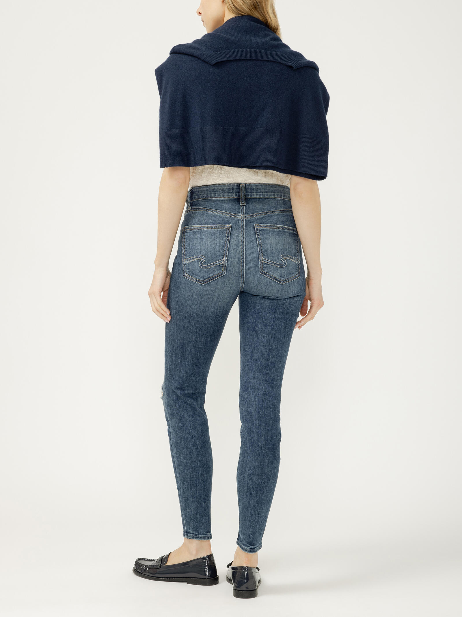 - Skinny jeans in a medium-dark indigo wash