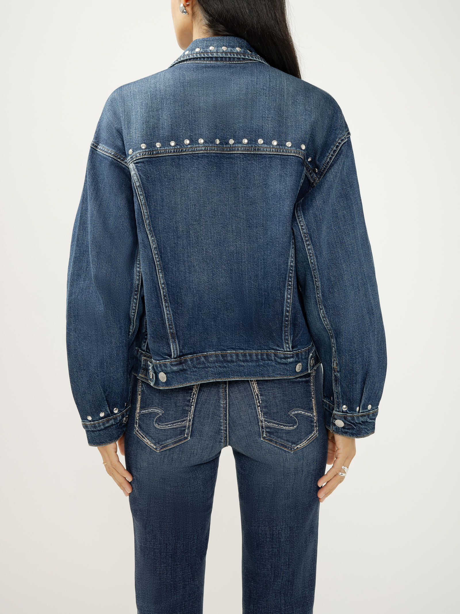 Give your look an extra touch of Silver with our fitted denim jacket, hand-studded for a unique, crafted finish. Made with just enough stretch and designed to give you a structured fit with the right amount of drape.