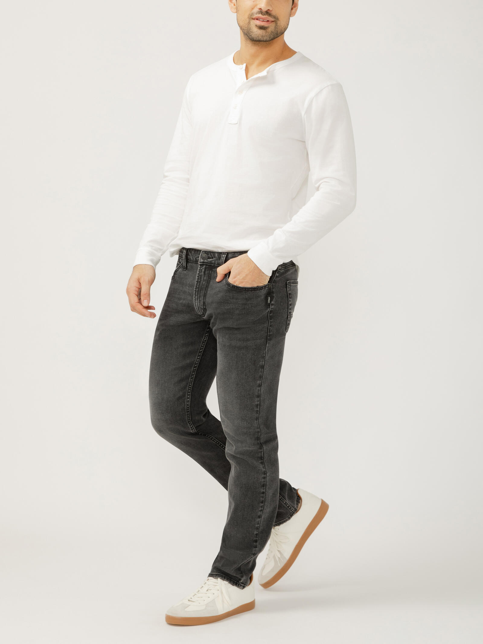 Sleek and streamlined from hip to ankle, our Desk to Dinner Konrad jean will have you dressed to impress from 9-5 and 5-9. This straighter slim fit jean hangs low on the waist and features a slightly roomier slim fit through the hip and thigh. Finished with a classic, everyday slim leg opening.
